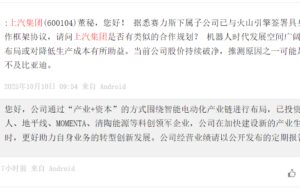 日前,有投资者向上汽集团提问称,“赛力斯下属子公司已与火山引擎签署具身智能业务合作框架协议,请问上汽集团是否有…