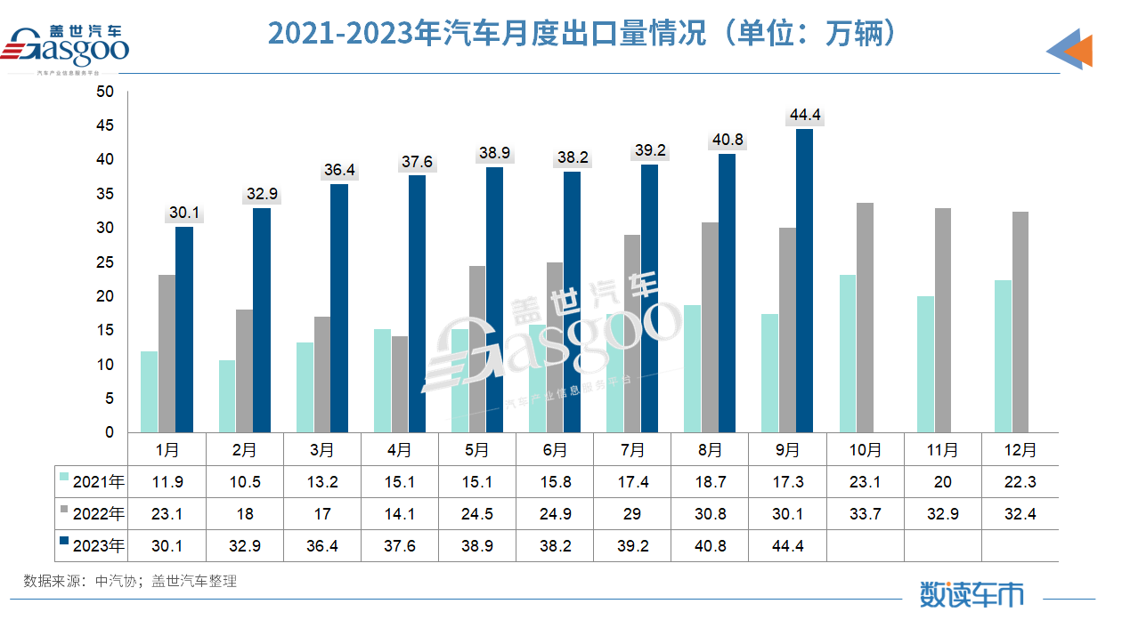 9月,我国月出口量再次突破40万辆,达到44.4万辆,环比增长9%,同比增长47.7%,其中,乘用车出口38.1万辆,环比增长9.3%,同比增长52.6%;商用车出口6.3万辆,环比增长6.6%,同比增长24%。