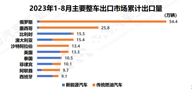 另据中国汽车工业协会整理的海关总署数据显示,1-8月,汽车出口321.6万辆,同比增长68.8%。中国汽车出口量前十的国家中,俄罗斯、西班牙市场表现较强,同比分别增长6.7倍和6.5倍。其中新能源汽车出口107.5万辆,同比1.1倍。新能源汽车出口的前三大市场为比利时、泰国和英国。