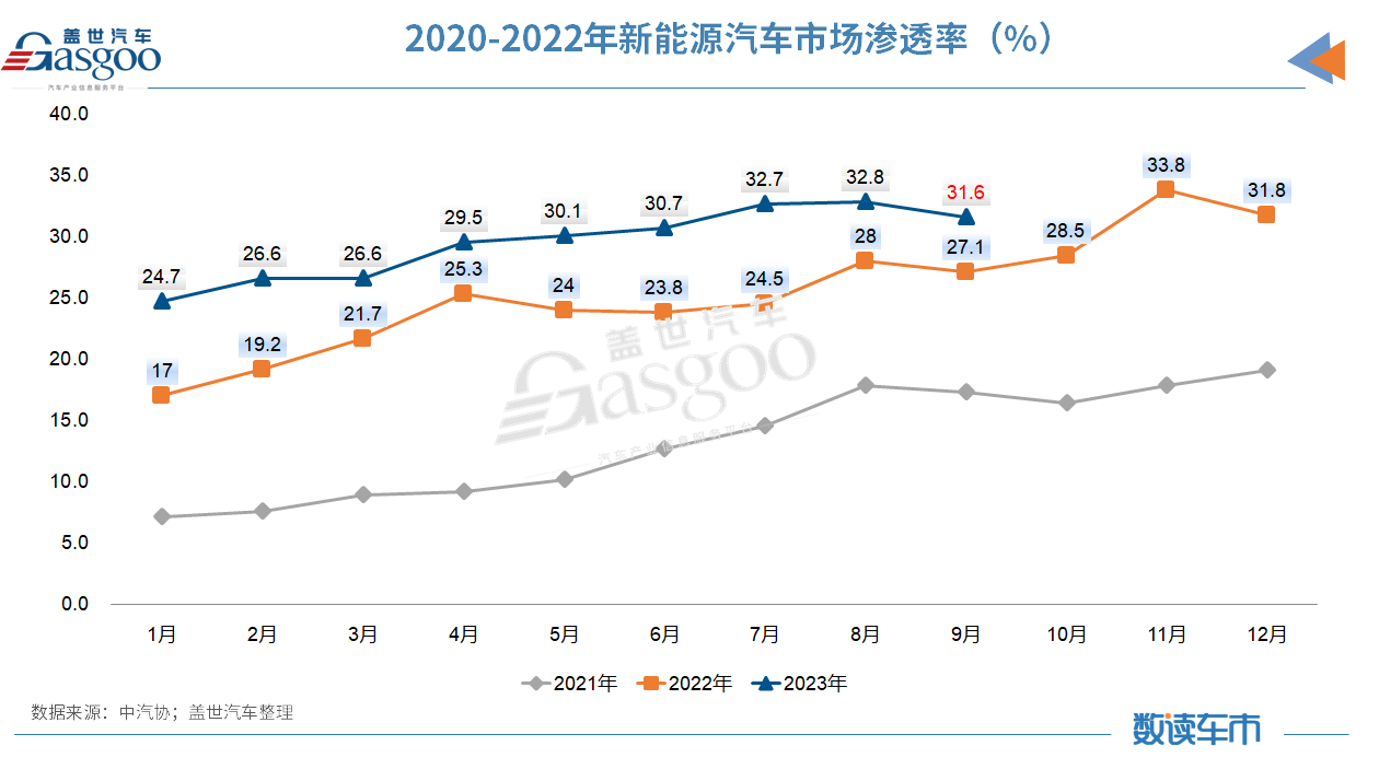 1-9月,新能源汽车产销累计完成631.3万辆和627.8万辆,同比分别增长33.7%和37.5%,市场占有率达到29.8%。
