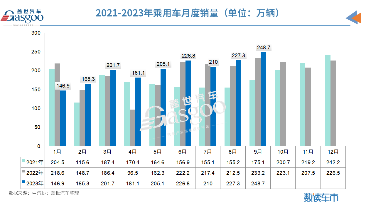 “金九”旺季在乘用车市场中体现得尤为明显。数据显示,9月,乘用车共销售248.7万辆,环比增长9.4%,同比增长6.6%。