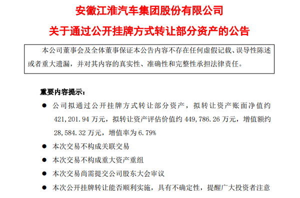 中国经济网10月24日讯(记者 陈梦宇)近日,江淮汽车(600418.SH)发布转让部分资产公告:“为进一步优化自身资产结构,经公司八届十二次董事会审议,公司拟通过公开挂牌方式转让部分资产,涉及乘用车公司三工厂存货、固定资产、在建工程、房屋建筑物以及土地使用权及乘用车公司新桥工厂构筑物和设备资产。”